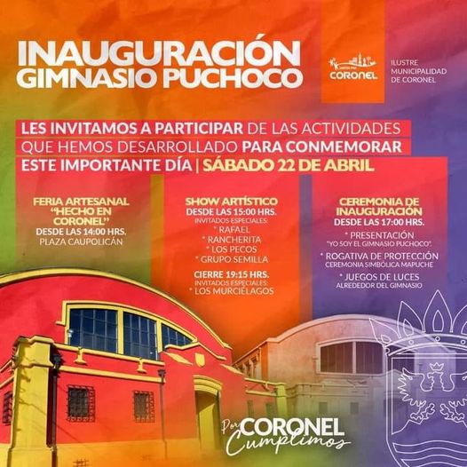 Este sábado 22 de abril se llevara acabo la gran inauguración del Gimnasio Puchoco Schwager . Te invitamos a participar de las actividades que desarrollaremos para conmemorar este gran día .No faltes te esperamos.